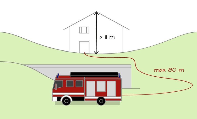 - Feuerwehrzufahrten müssen so nahe an das Gebäude heranführen, dass ein wirksamer Einsatz der Feuerwehr möglich ist. Bei Gebäuden mit grossem Verkehrsaufkommen wie grossflächigen Dienstleistungs- und Gewerbebetrieben, Industrie- und Parkinganlagen, legt die Brandschutzbehörde in Abstimmung mit der Feuerwehr die Anforderungen an die Zugänglichkeit im Einzelfall fest.
